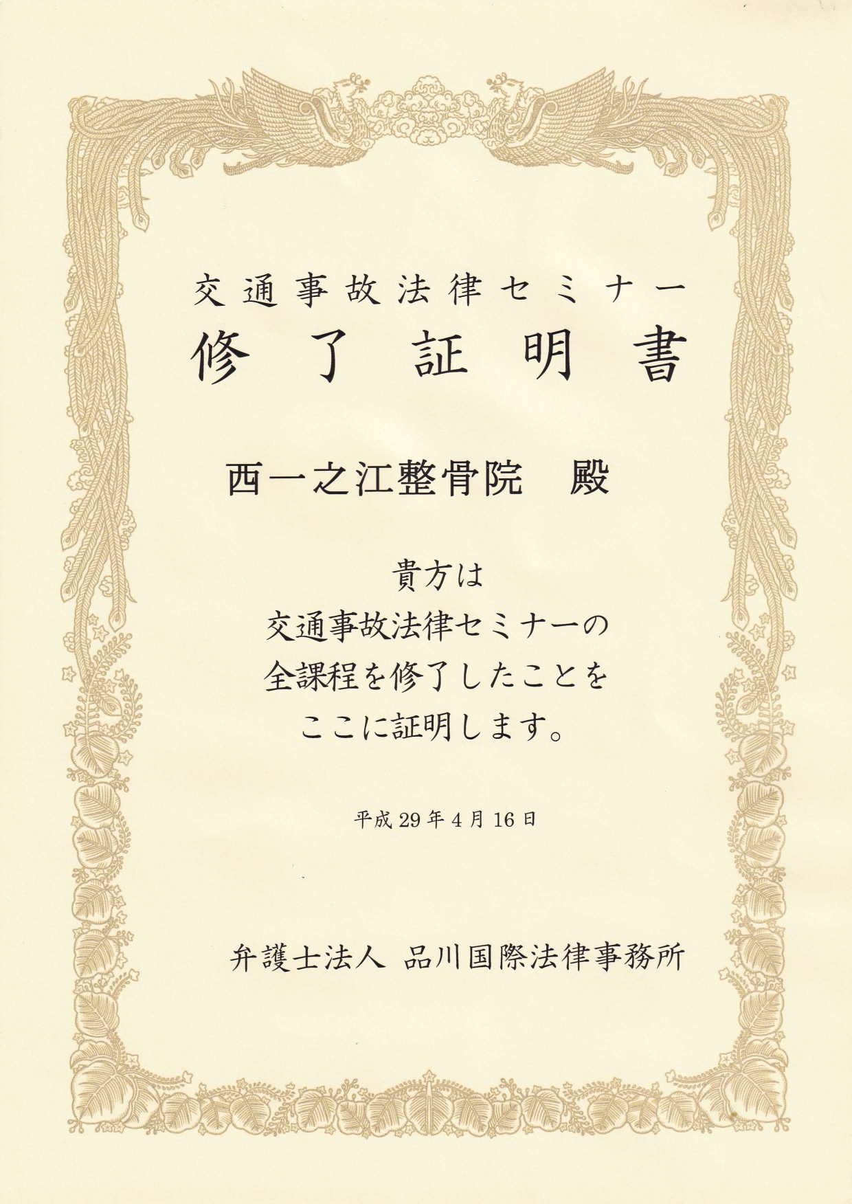 弁護士事務所から認定を頂いております(認定証)