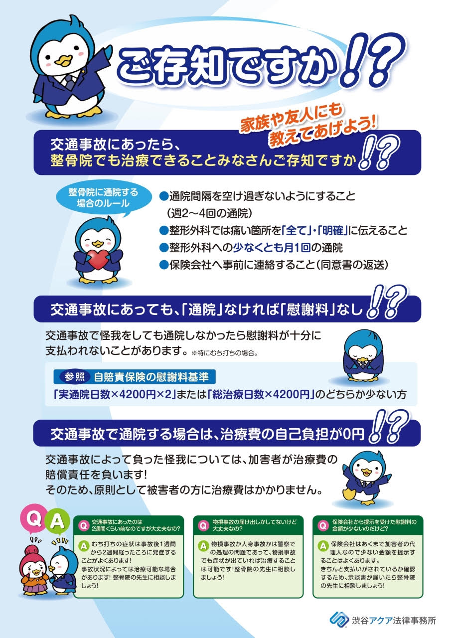 交通事故を専門に扱っている弁護士事務所(渋谷アクア法律事務所)と連携しているので保険会社との対応や今後どのようにしていけばいいのか、慰謝料に関してなどすべてサポート、アドバイスさせていただきます。